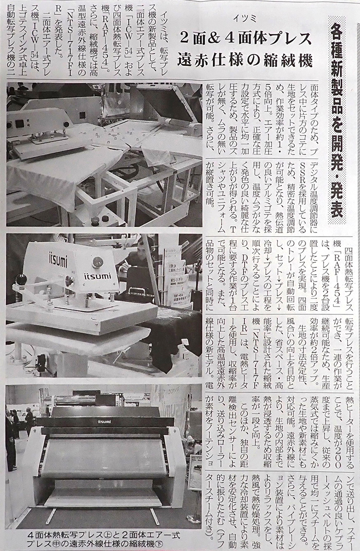 最新機種の二面体エアー式プレス機「ICW-54」、四面体熱転写プレス機「RAF-454」、高温型遠赤外線仕様の縮絨機「NTS-717FIR」を取り上げていただきました。