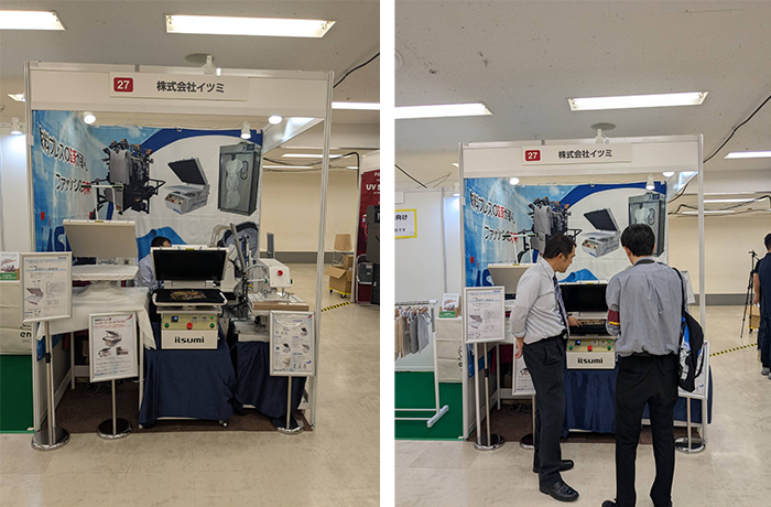 弊社としては初めてのアパレル関連展示会への出展となりました。元アサヒ繊維機械㈱様の機械を中心にPRするため出展致しました。小型熱転写プレス機を展示し、多くの方に展示ブースにご来場頂きました。誠にありがとうございました。