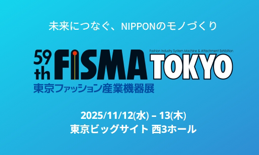 2025年11月12日(水)から11月13日(木)に、東京ビッグサイト 西3ホールにて開催される「59th FISMA TOKYO (東京ファッション産業機器展)」に出展いたします。